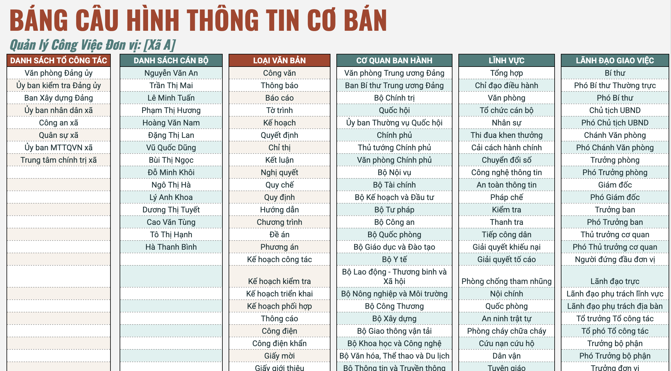 Quản lý công việc, văn bản ý kiến chỉ đạo phiên bản 2.0 là template Google Sheets được thiết kế dành cho cơ quan, đơn vị, bộ phận hành chính – tổng hợp hoặc quản lý nội bộ, giúp theo dõi toàn bộ văn bản chỉ đạo từ cấp trên, tình trạng xử lý, tiến độ thực hiện và deadline của từng nhiệm vụ một cách rõ ràng, trực quan.
